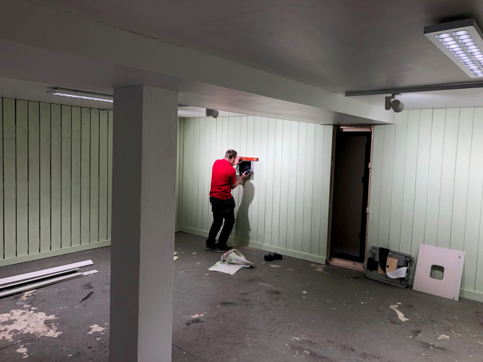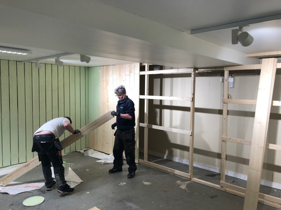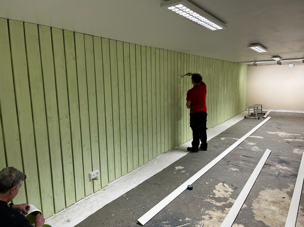 I februari och mars 2023 har föreningens medlemmar arbetat vidare med anpassning av lokalen för våra behov. Vi har målat väggar och byggt den vägg där vi monterar våra tavlor och kulfång.
